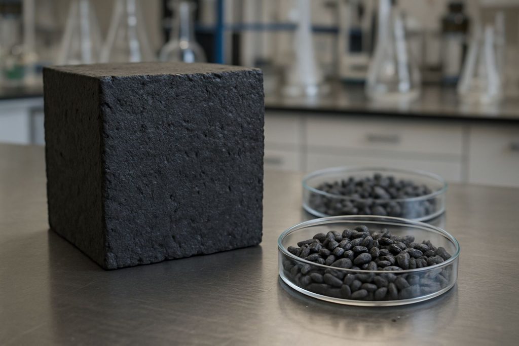 El Biochar generado aun a temperaturas elevadas es violentamente comprimido, sintetizando las partículas para generar ya sea bloques o pellets de biomasa carbonizada.